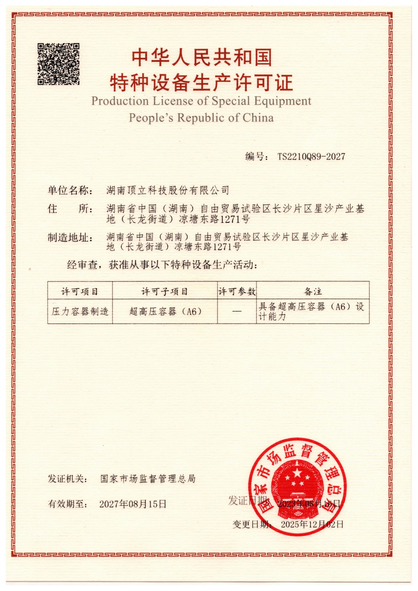 特种设备生产许可证(压力容器A6)